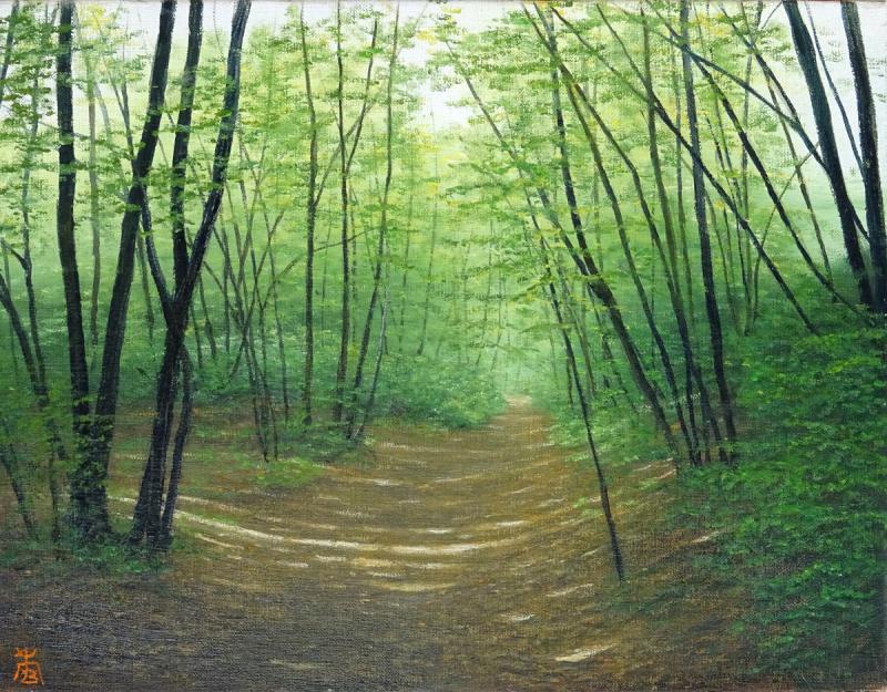 今も僅かに残る武蔵野の風景を求めて描き続けています。季節の色を映す雑木林、木洩れ日の道、懐かしくいつでも触れる人を和ませてくれる風景を情感豊かに描く人気作家です。