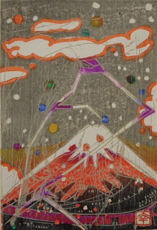 雷鳴富士 木版画 15 X 10cm